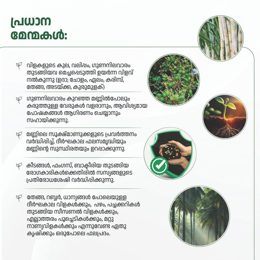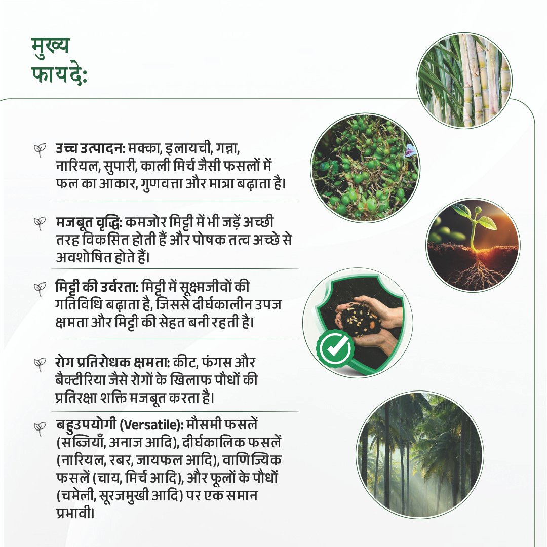 larger yields, and higher-quality produce across all crops, like maize, soya, sugarcane, coconut